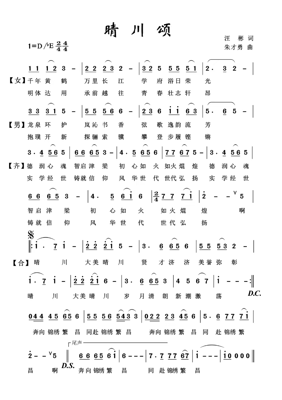 (末章高歌长吟:“啊,晴川,大美晴川”——由衷欢呼;“贤才济济,美誉弥彰”——自豪、赞美;“岁月清朗,新潮激荡”——从历史到现实,总体慨叹。尾声重章叠句,激情咏叹:“奔向”——鼓励每一位晴川人;“同赴”——寄希望于“晴川”这一新进高等院校的整体发展,“锦绣繁昌”——目标明确,意味深长,声震江天,余音回响!)