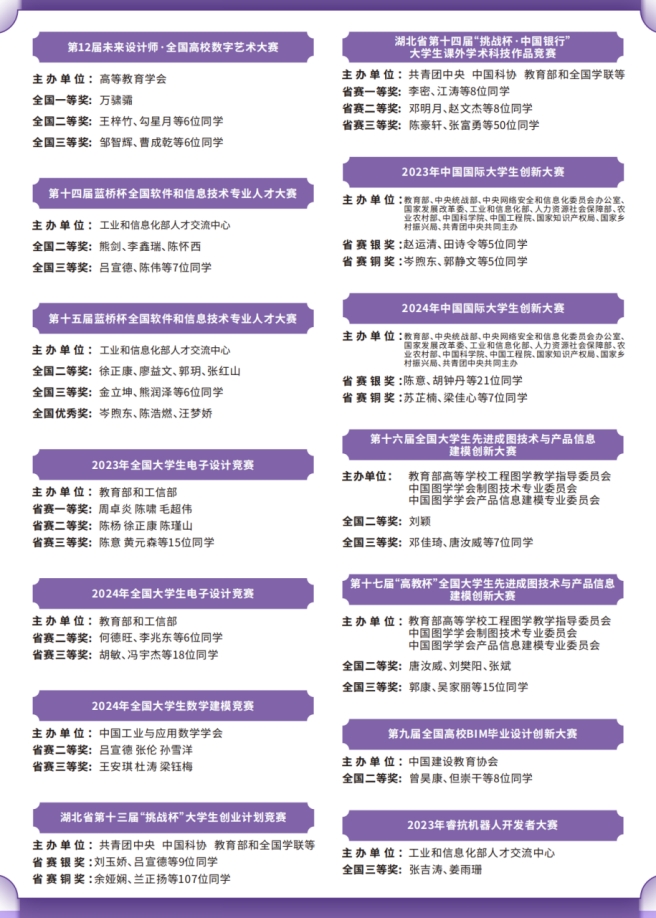 学校按照“覆盖全体、融入专业、分类实施、强化实践、贯穿全程”原则,以相关学科为依托,坚持竞赛与教学、竞赛与科研、竞赛与“双创”的有机融通,注重引导创新“作品”变“产品”;基于学科专业方向,组建师生创新团队,将课堂教学与学科竞赛项目结合;依托省级大学生创新创业示范基地、创新实验室、工程实验室、创客空间平台,将课程与项目、团队、科研、教研、竞赛融为一体,按照国家、省级、校级三级组织引导大学生开展竞赛活动,展示新时代大学生创新能力和成果,充分发挥竞赛育人作用,实现以赛促教、以赛促学、以赛促创的良好局面。学科竞赛已成为学校的一张名片,《“教训赛创”四维立体驱动的电子商务类应用型人才创新创业能力提升探索与实践》获第九届湖北省高等学校教学成果奖。