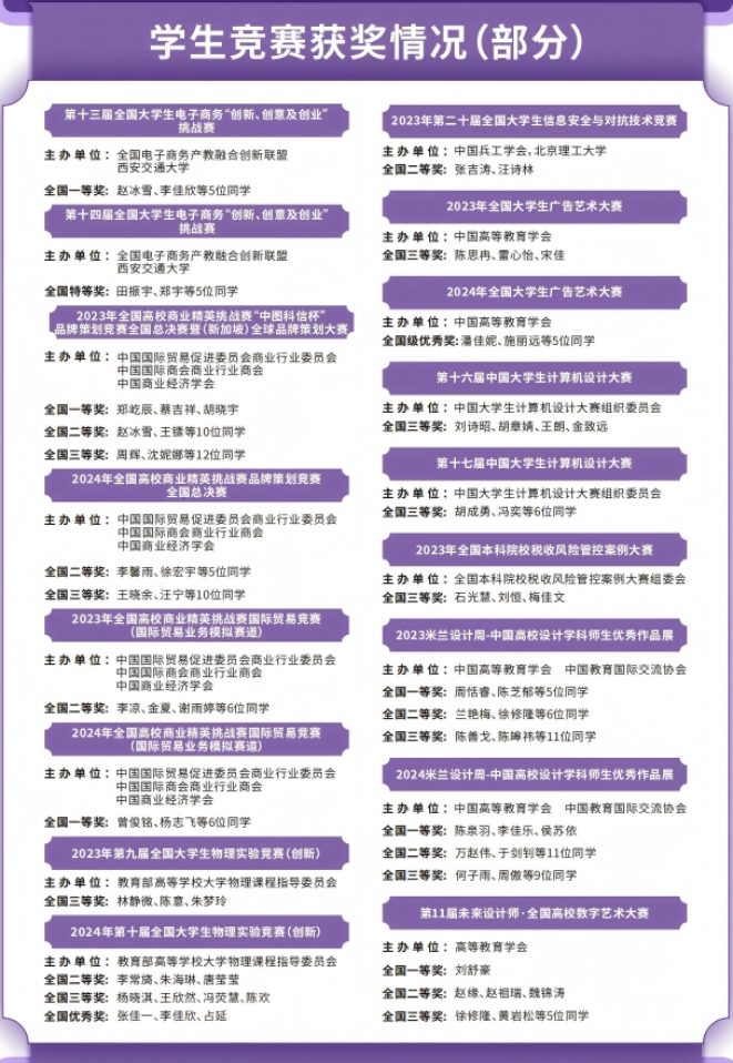 近三年,学校获批大学生创新创业训练计划120项,就业育人项目立项22项;教育部A类学科竞赛中获省级以上奖项400余项。在中国国际大学生创新大赛中,累计获5银8铜。据全国高等学校计算机教育研究会牵头发布的全国普通高校大学生计算机竞赛指数结果显示,学校计算机类学科竞赛成绩2023年、2024年居全国本科高校Top24%,2025年居Top21%(位列全国1176所评价榜单本科高校第250位)