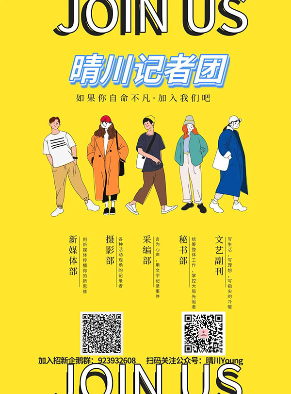 晴川记者团分为五个部门,这是一个聚集了一群真实且热爱新闻的人的团体,这里需要拥有足够的热情并有责任心的你!