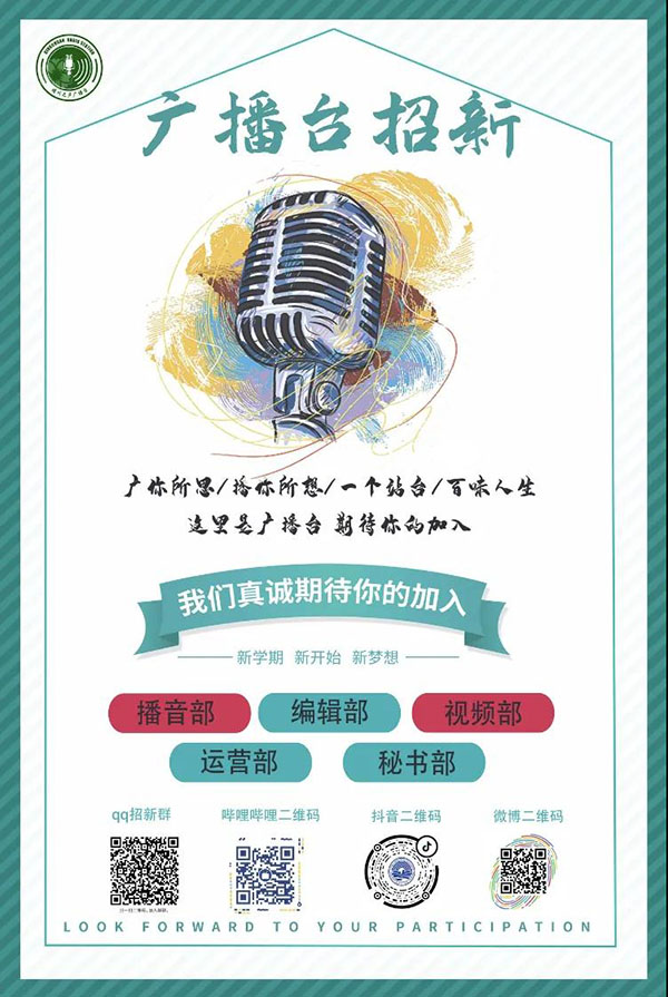 这里有最新的流行资讯,最精彩的校园新闻,最炫的音乐,最酷的时尚,最high的报道。用心吐字,用爱归音 ,用声音传递快乐,用语言释放青春!播音部期待你的加入,有你晴川之声才更加精彩!