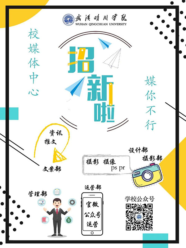 武汉晴川学院新媒体中心隶属于校党委宣传部,是官方新媒体运营的校级学生组织,主要负责运营武汉晴川学院官方微信、微博等公共平台。我们是"5G无限海域冲浪选手",活跃在晴川的各个角落,捕捉校园热点、追随潮流风向,紧贴校友内心,用专业和热爱,让你不出宿舍也可获取今日晴川新鲜事。