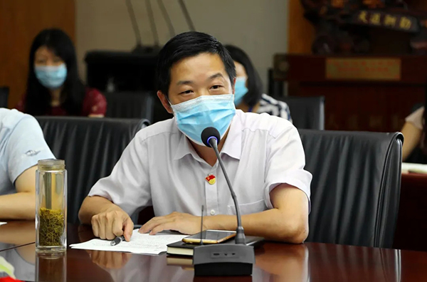 外国语学院教师党支部书记易静介绍了疫情期间支部党员教师开展线上教学、舍小家顾大家投身抗疫的事迹。