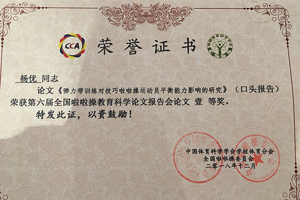 本网讯(记者 熊梦陶)近日,第六届全国啦啦操教育科学论文报告会获奖论文揭晓,武汉晴川学院公共课部体育教研室杨优老师凭借论文《弹力带训练对技巧啦啦操运动员平衡能力影响的研究》荣获全国一等奖。