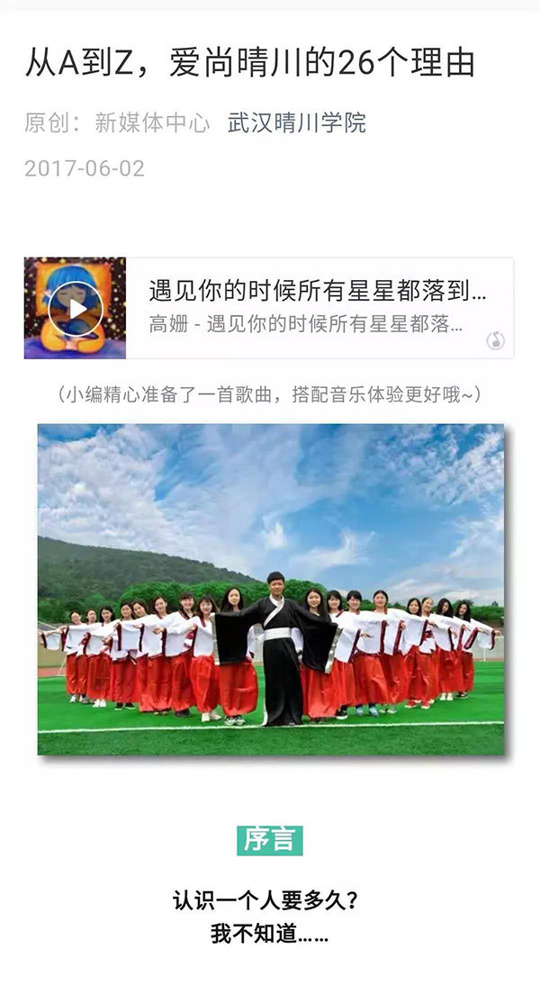 新媒体类二等奖《从A到Z,爱尚晴川的26个理由》以26个英文字母为线索,从26个角度列出武汉晴川学院的独特风采,带大家全方位领略美丽晴川、大爱晴川、魅力晴川、平安晴川、特色晴川。