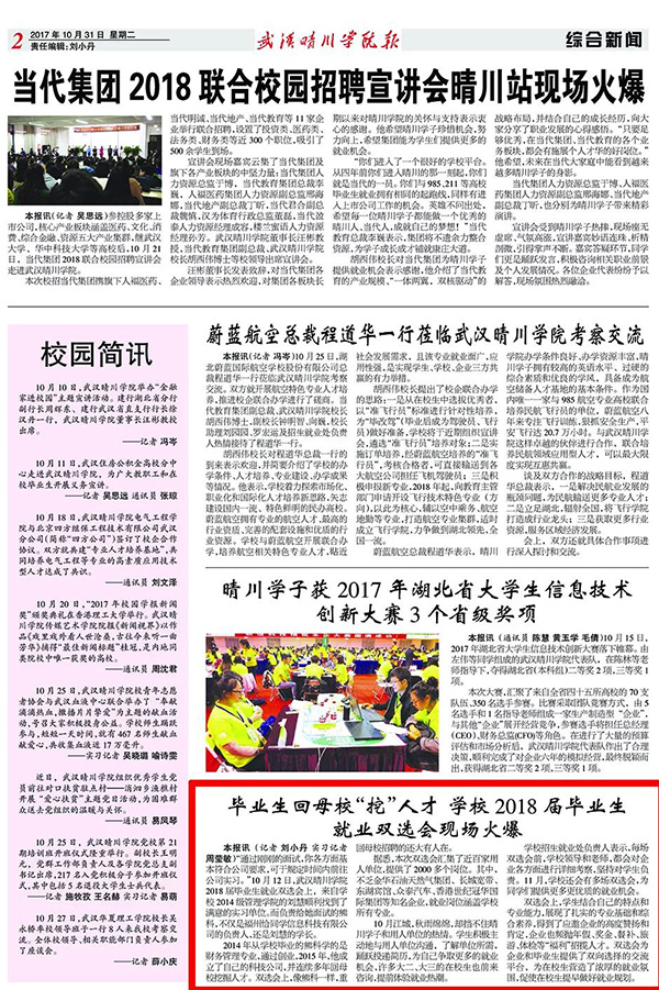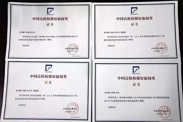 校报作品《毕业生回母校“挖”人才》荣获消息类二等奖;官方微信公众号文章《从A到Z,爱尚晴川的26个理由》获得新媒体类二等奖;校报2017年9月29日第4版军训特辑获得版面类三等奖。