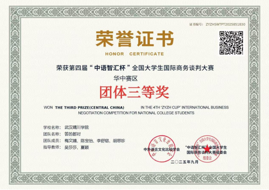 比赛中,武汉晴川学院学子沉着应对,凭借扎实的专业知识、清晰的谈判思路与流畅的英语表达赢得了评委的一致认可。其中,由王德琳、周欢、刘畅、陈盈盈组成的“Gentlee Team”团队荣获华中赛区二等奖;由周诗文、王琼、李燕、杜乐同学组成的“Horizon Group”团队和由梅文婧、陈宝怡、李舒窃、胡思珍组成的“答的都对”团队分获华中赛区三等奖。值得一提的是,“Gentlee Team”凭借优异表现成功晋级全国总决赛,将与其他赛区的优秀团队同台竞技。