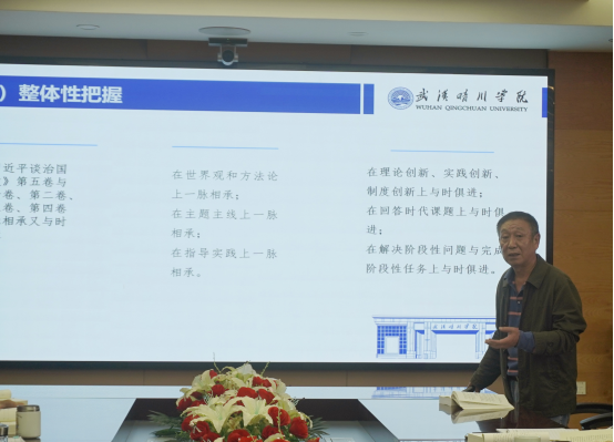 刘启春院长以“坚持以新思想引领新征程——深学细悟《习近平谈治国理政》第五卷”为题,围绕《习近平谈治国理政》第五卷的出版意义、逻辑结构与理论特色以及学习的基本要求进行了系统深入的解读。他指出,《习近平谈治国理政》第五卷的出版发行,对推动广大党员、干部和群众深入学习贯彻习近平新时代中国特色社会主义思想,深刻领悟“两个确立”的决定性意义,增强“四个意识”、坚定“四个自信”、做到“两个维护”,为实现强国建设、民族复兴伟业团结奋斗具有重要意义,对于促进国际社会加深对中国理念、中国方案、中国智慧的理解,携手共建人类命运共同体,具有深远的影响。要将《习近平谈治国理政》第五卷和第一卷至第四卷作为一个整体,作为思想政治教育和课堂教学的重要内容,扎实推进党的创新理论进教材、进课堂、进头脑工作,引导广大党员、干部持之以恒读原著学原文悟原理,做到学思用贯通、知信行统一,切实把学习成果转化为奋进新征程、建功新时代的强大动力。