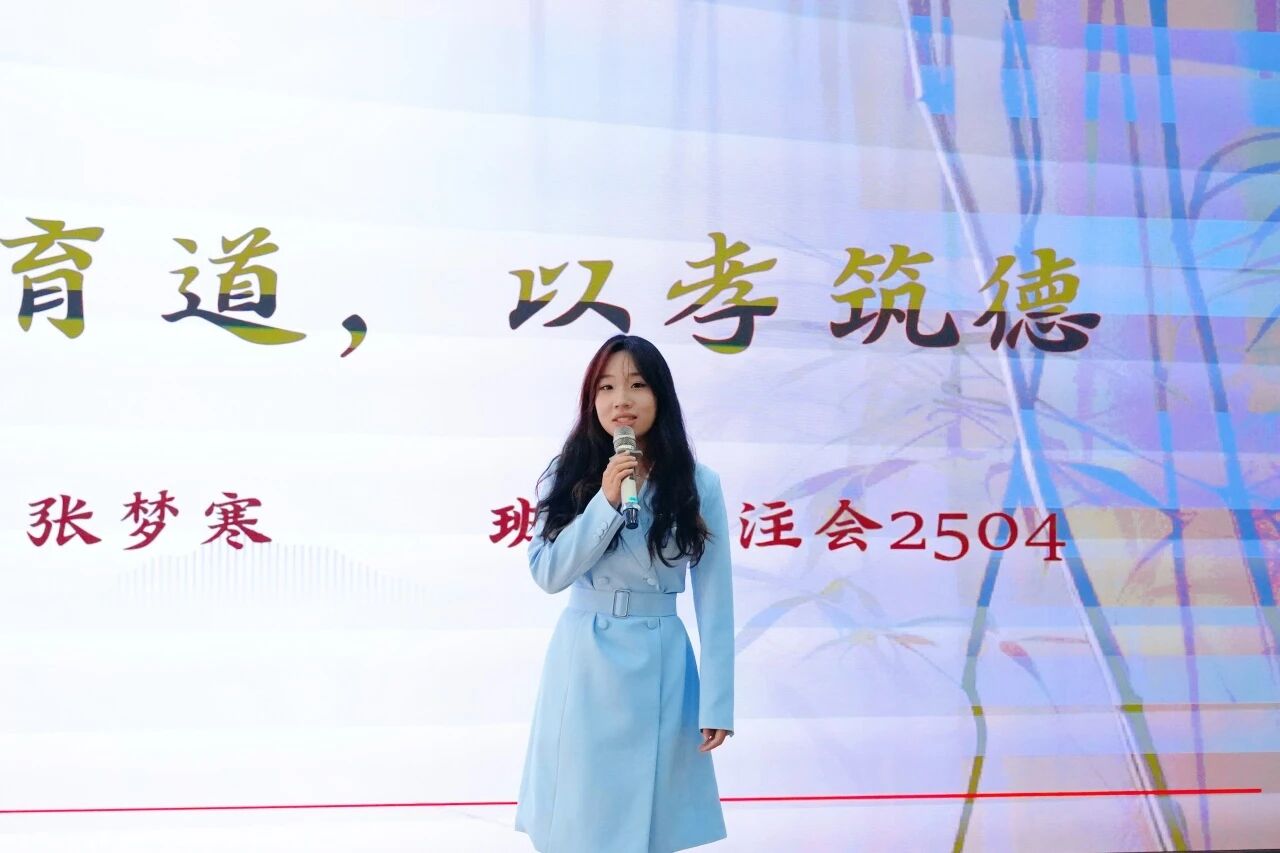 此外,传媒艺术学院高雅书呼吁“孝在当下”,设计工程学院叶美希描绘“山海不及”的亲情,计算机学院王诗博以古鉴今阐述孝道历久弥新,传媒艺术学院陈慧系统解析“看见、懂得、成为”三重境界,北斗学院郭佳诚分享以智慧跨越距离的尽孝实践,会计学院徐凯歌则反思孝心难以量化的情感本质。九位讲述者以真挚语言与鲜活故事,共同勾勒出一幅融传统底蕴与时代气息于一体的孝德实践画卷。