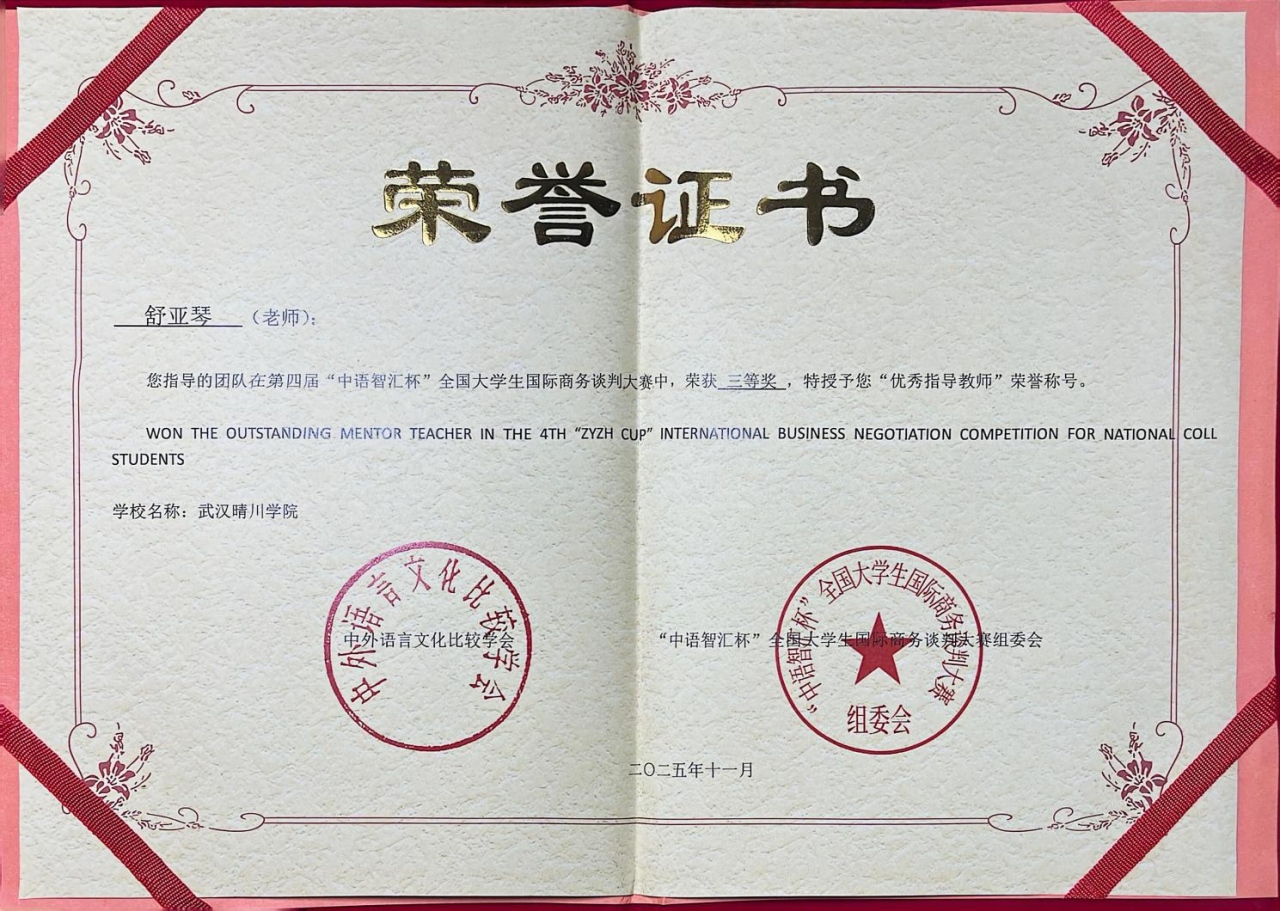 本次大赛由中外语言文化比较学会及赛事组委会联合主办,旨在推动高校国际商务谈判人才培养与课程体系建设。全国总决赛采用线上面对面谈判的形式,分三轮进行,全面考察参赛选手的商务知识储备、逻辑思维、团队协作与临场应变能力。晴川学子在比赛中沉着冷静、配合默契,展现了扎实的专业素养与良好的精神风貌。