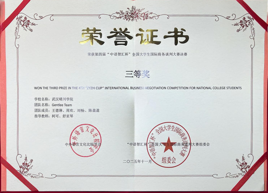 (通讯员:柯可 编辑:刘小丹)近日,在第四届“中语智汇杯”全国大学生国际商务谈判大赛全国总决赛中,武汉晴川学院外国语学院与来自全国高校的143支晋级队伍同台竞技,团队(成员:王德琳、周欢、刘畅、陈盈盈)在柯可、舒亚琴两位教师的指导下,凭借扎实的功底、稳定的发挥与出色的团队协作,最终荣获全国三等奖。柯可、舒亚琴老师获评“优秀指导教师”,柯可老师还应邀担任了本届大赛全国总决赛的评委。