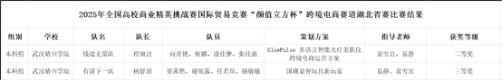 (本网讯 通讯员|程雨洁 易静)近日,2025年全国商业精英挑战赛国际贸易竞赛跨境电商赛道湖北省赛成绩正式揭晓。外国语学院组织的两支队伍在易静、袁雪宜和李晶三位老师的悉心指导下,凭借扎实的专业功底与创新的运营方案,在全省众多高校的激烈角逐中脱颖而出,分别斩获二等奖与三等奖,并成功晋级全国总决赛。