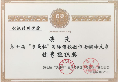 (来源:外国语学院 通讯员:房宇华)近日,第七届“求是杯”国际诗歌创作与翻译大赛获奖名单正式公布。武汉晴川学院学子在本届赛事中表现出色,共获得国家级奖项7项、省级奖项7项,实现了我校在该项高水平赛事中的突破。