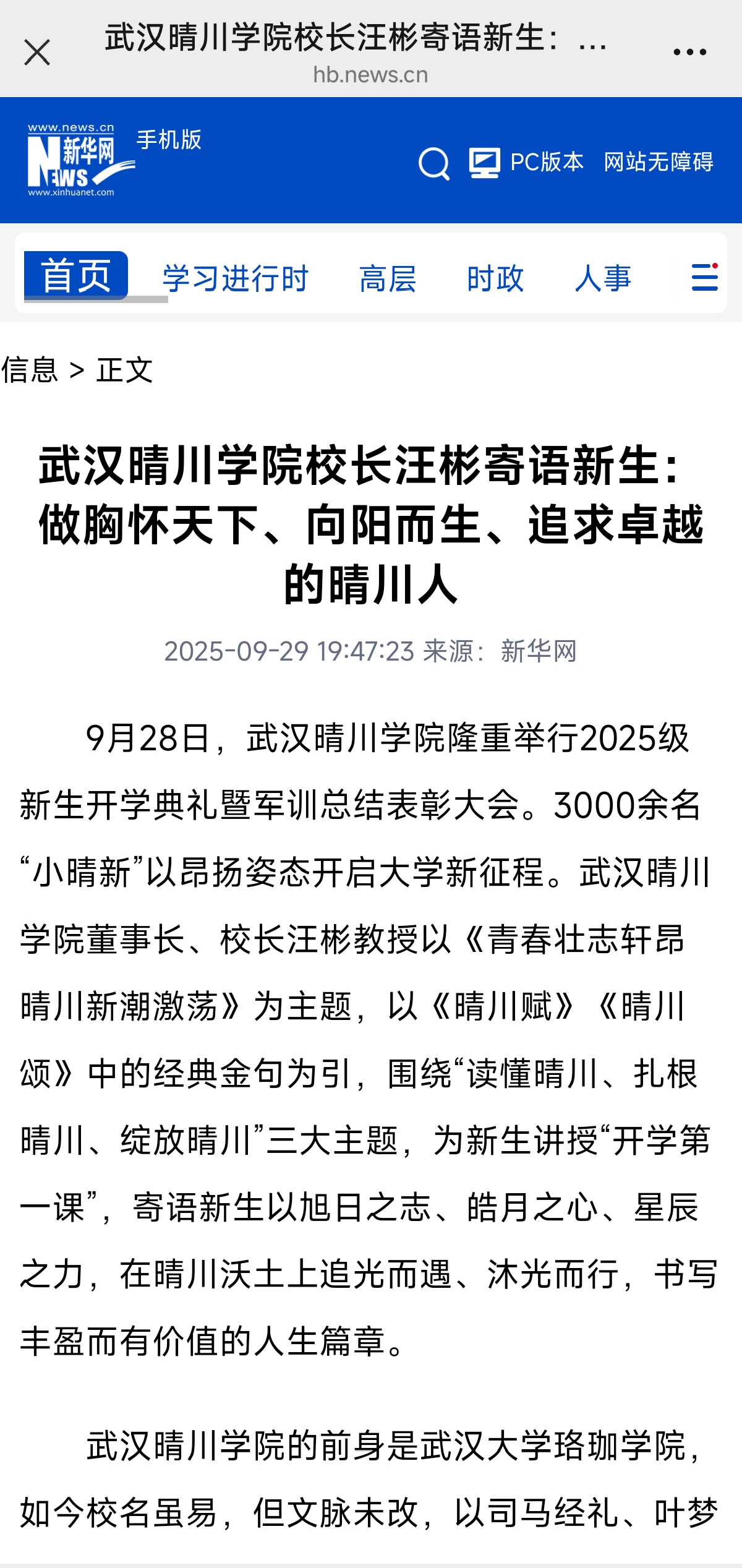 “晴川的美,不止在湖光山色,更在于这里独特的精气神。”来自传媒艺术学院的新生李欣然表示,她将铭记校长开学第一课的教诲,以“向阳而生”的姿态前行,在晴川的沃土上扎根、生长、绽放,做无愧于时代的新一代晴川人。(刘小丹、刘蕾)