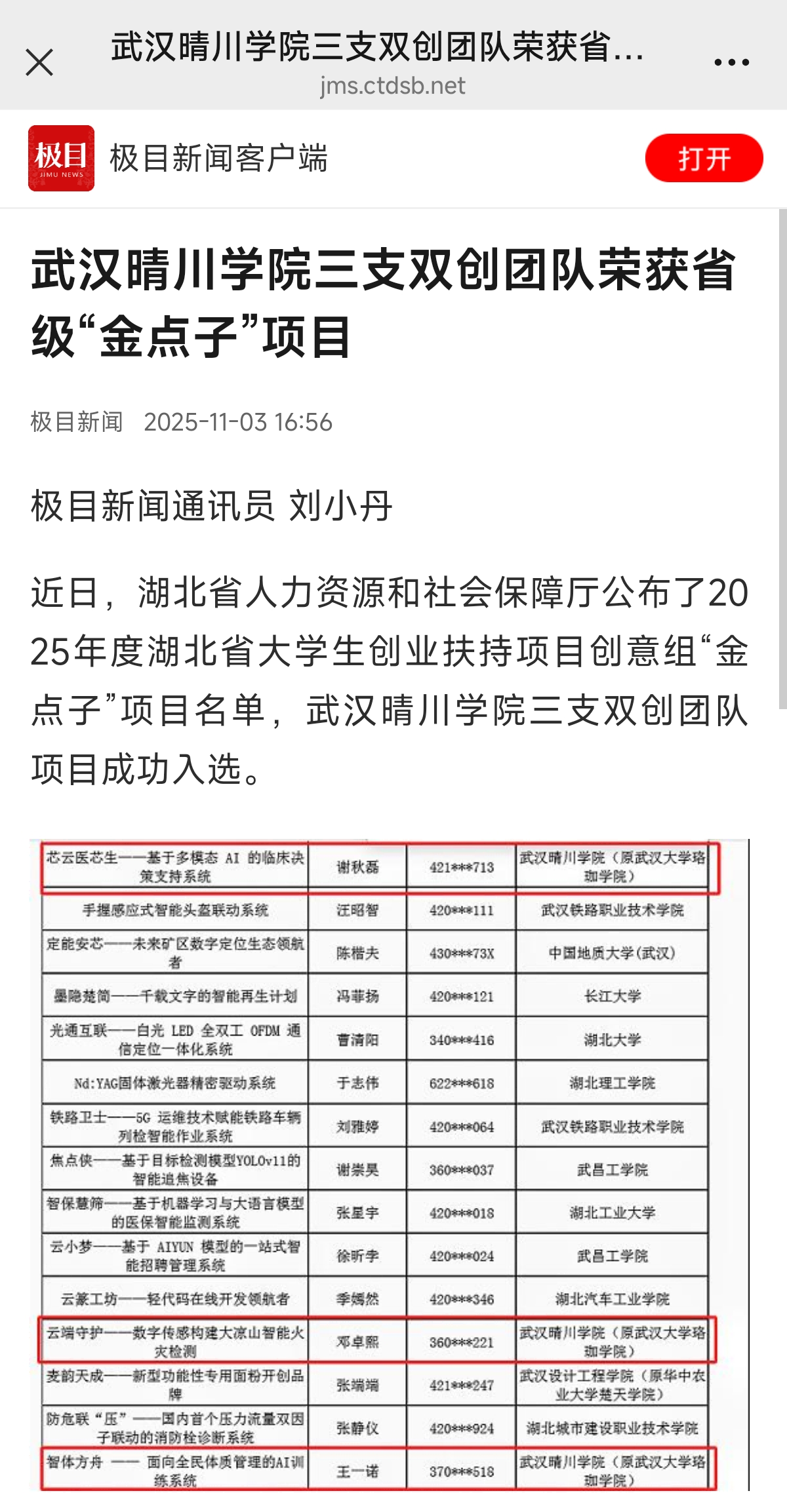 近日,湖北省人力资源和社会保障厅公布了2025年度湖北省大学生创业扶持项目创意组“金点子”项目名单,武汉晴川学院三支双创团队项目成功入选。