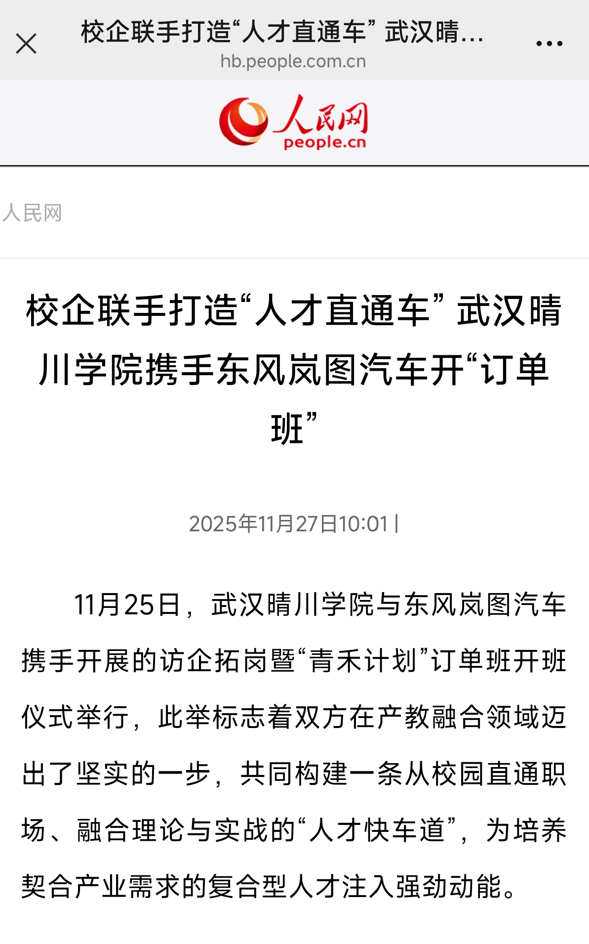 11月25日,武汉晴川学院与东风岚图汽车携手开展的访企拓岗暨“青禾计划”订单班开班仪式举行,此举标志着双方在产教融合领域迈出了坚实的一步,共同构建一条从校园直通职场、融合理论与实战的“人才快车道”,为培养契合产业需求的复合型人才注入强劲动能。