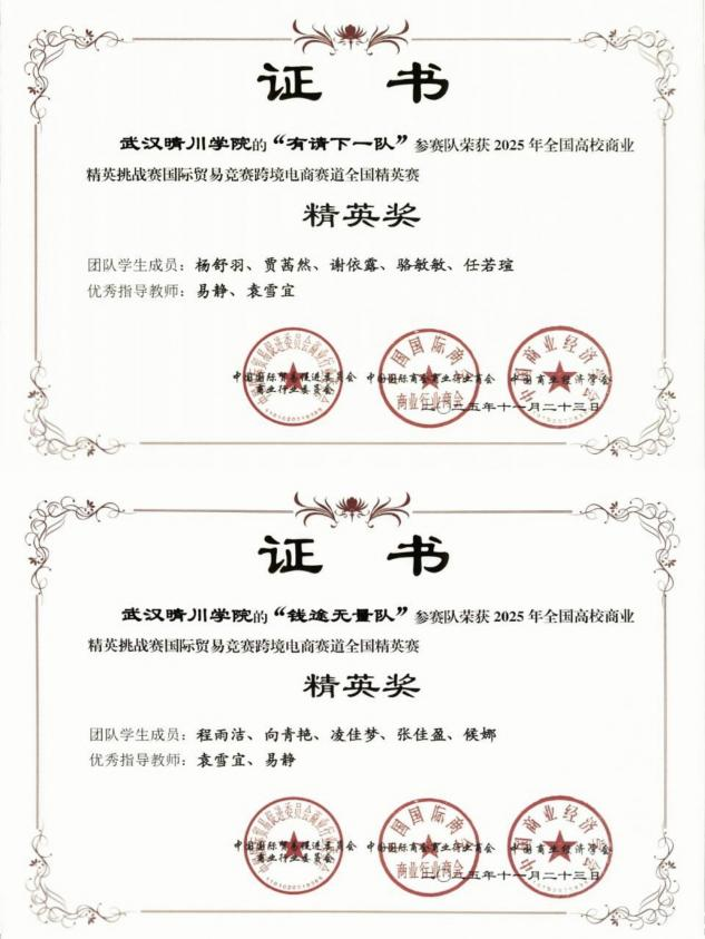 近日,2025年全国高校商业精英挑战赛国际贸易竞赛跨境电商赛道全国精英赛圆满落幕。本届赛事共吸引来自全国近500所高校、5000余支队伍报名参赛,经过知识赛、校赛、省赛和国赛的层层选拔,最终60余支顶尖团队齐聚全国总决赛。武汉晴川学院外国语学院的“有请下一队”和“钱途无量队”在指导老师易静、袁雪宜、李晶的悉心指导下,在全国众多高校队伍的激烈角逐中脱颖而出,双双斩获2025年全国商业精英挑战赛国际贸易竞赛跨境电商赛道全国总决赛一等奖、全国精英赛精英奖,全国精英赛(展洽组)一等奖,武汉晴川学院获“最佳院校组织奖”荣誉称号。