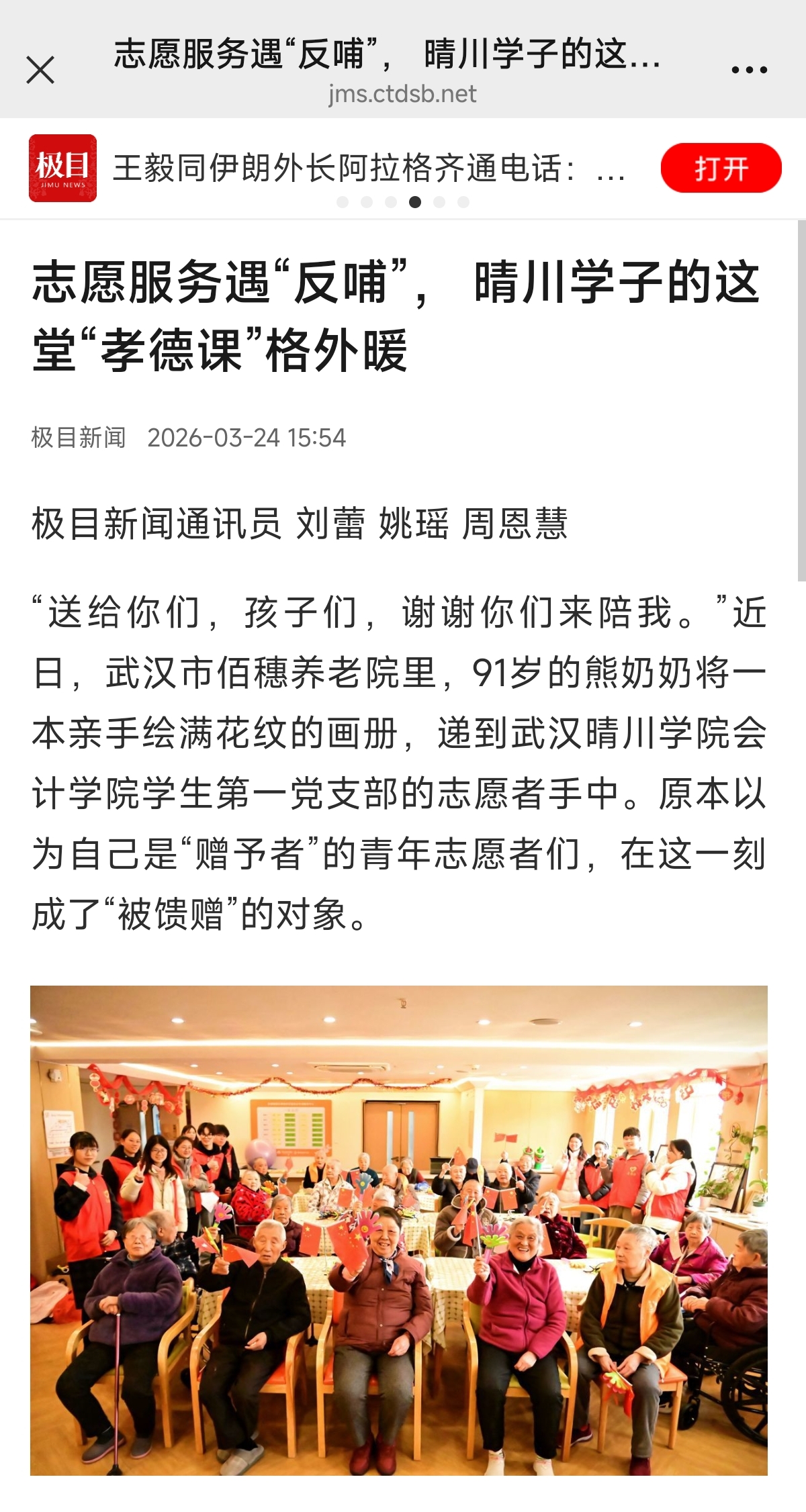 (通讯员:刘蕾 姚瑶 周恩慧)“送给你们,孩子们,谢谢你们来陪我。”近日,武汉市佰穗养老院里,91岁的熊奶奶将一本亲手绘满花纹的画册,递到武汉晴川学院会计学院学生第一党支部的志愿者手中。原本以为自己是“赠予者”的青年志愿者们,在这一刻成了“被馈赠”的对象。